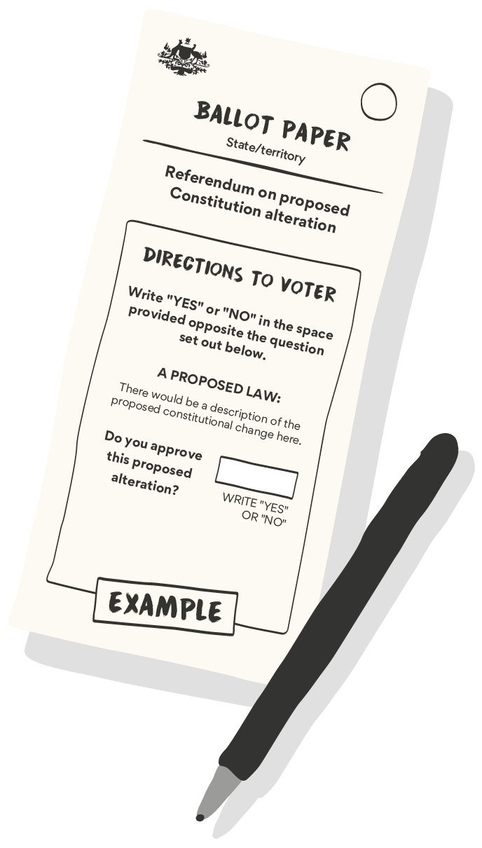 As described on the Australian Electoral Commision website, you will receive a ballot paper with the proposed alteration to the Constitution, followed by a question asking if you approve. On the ballot paper, you need to indicate your vote by clearly writing the word Yes if you approve of the proposed alteration, or the word No if you do not approve.