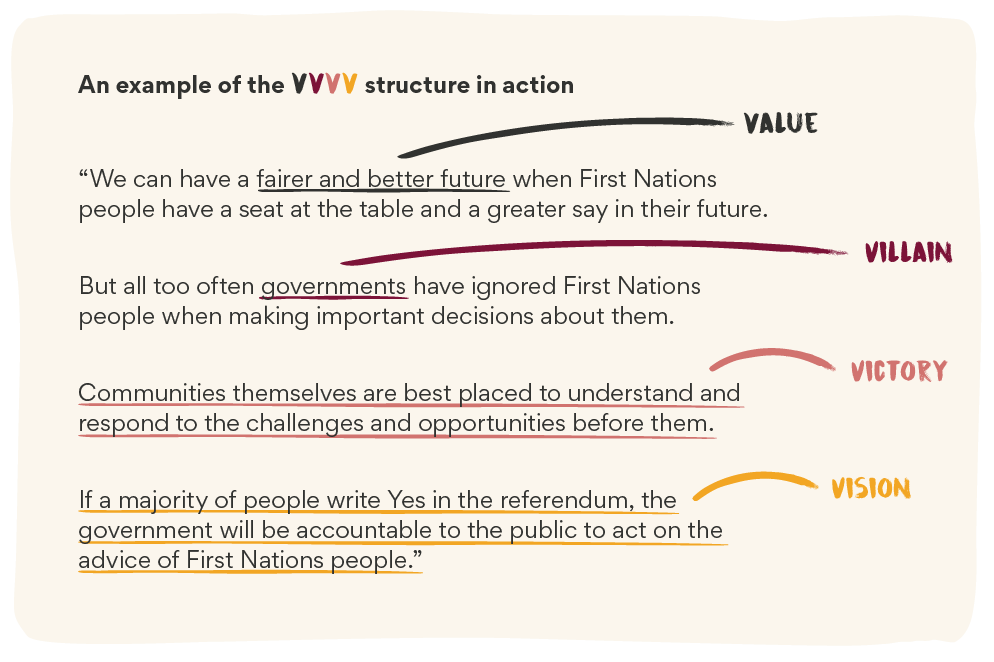 Wrap up your message with a vision of a positive, hopeful future. This provides hope to our base and persuadables who genuinely want better lives for First Nations people.