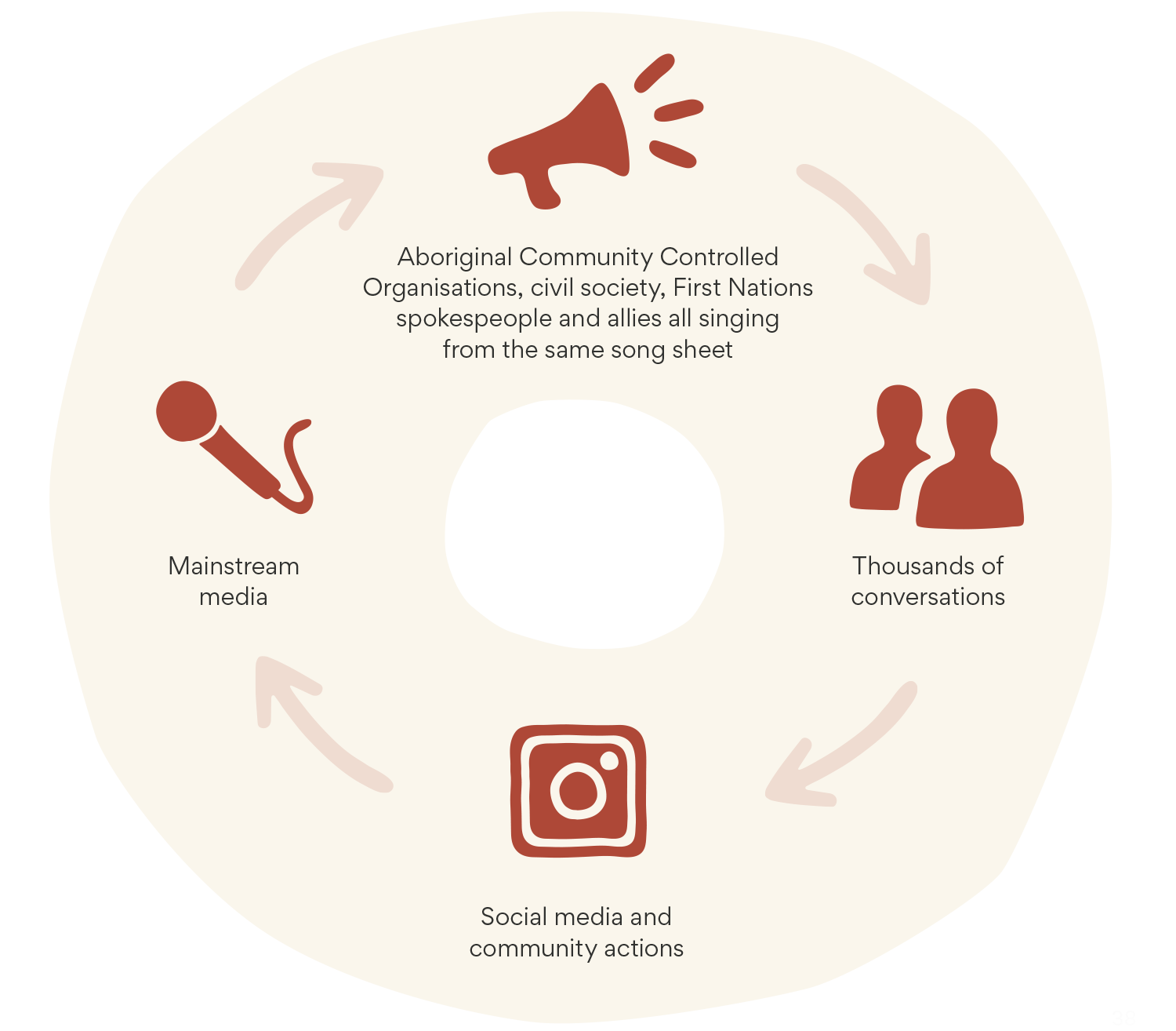 We change the narrative by all singing from the same song sheet – across First Nations organisations, civil society organisations, First Nations spokespeople and allies. Together we can flood conversations and social media with our aspirations for change, and in turn shape the national media narrative.