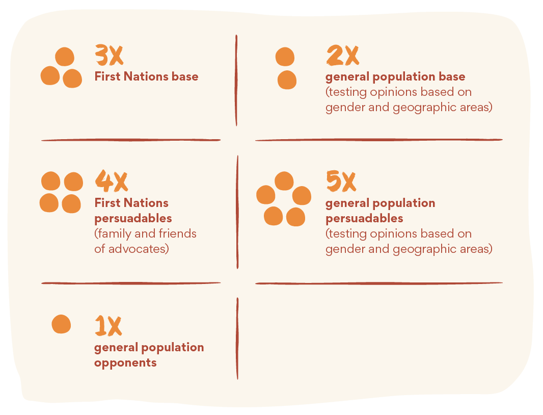 The research team then went on a (virtual!) road trip to do nine focus groups with First Nations advocates, the base, persuadables and opponents. This helped us to understand where these audiences are at, and how they respond to our messages and narratives.